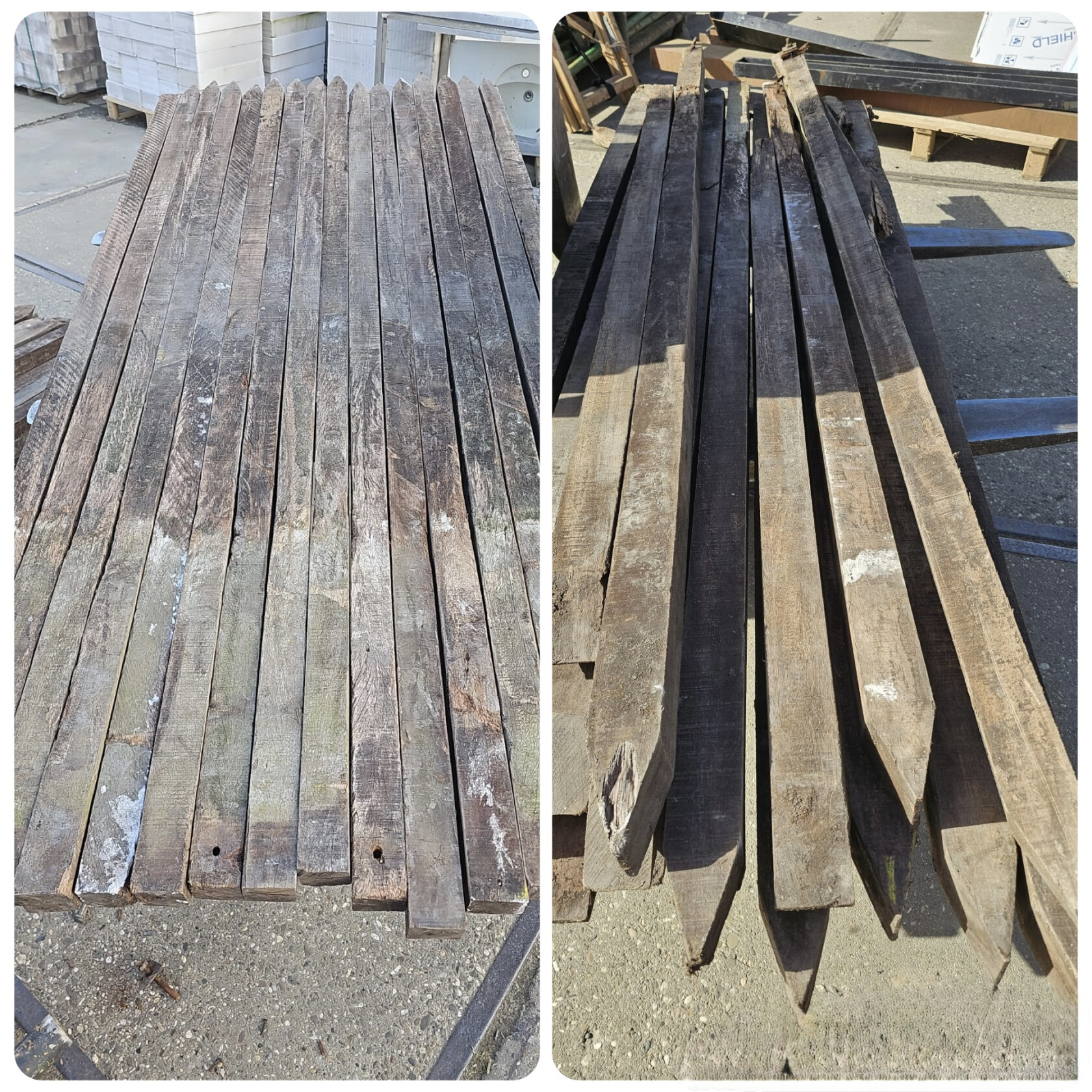 Partij hardhouten vierkante palen, met punt. Nog goed voor een 2e Kans.