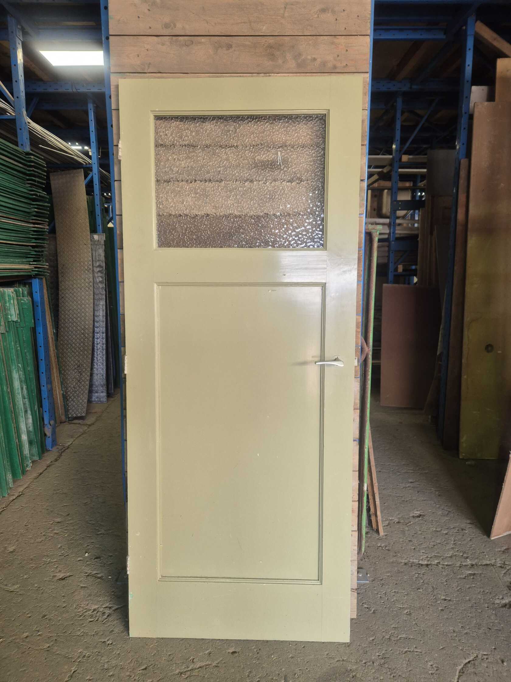 Gebruikte paneeldeur in nette staat. De deur bevat twee vakken waarvan één uit glas.