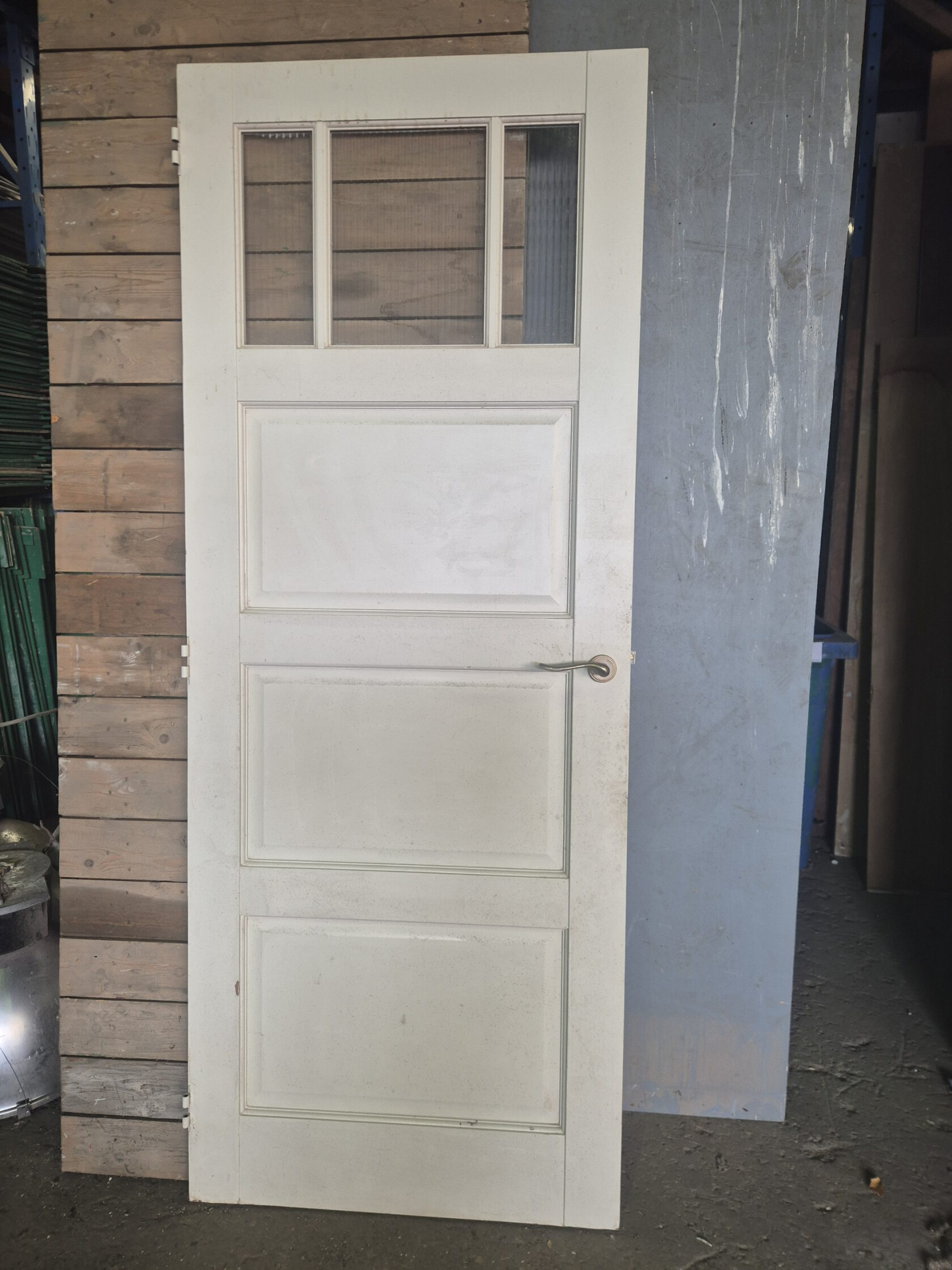 Keurige paneeldeur met vier vakken waaronder één glazen vak. Deze deur is voorzien van een bijpassende deurklink.
