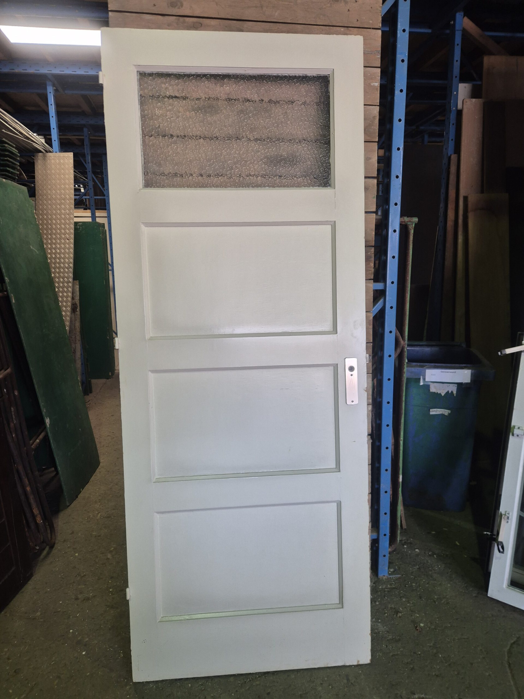 Binnendeur met vier vakken waaronder 1 vak met glas. Het is een nette stompe binnendeur.