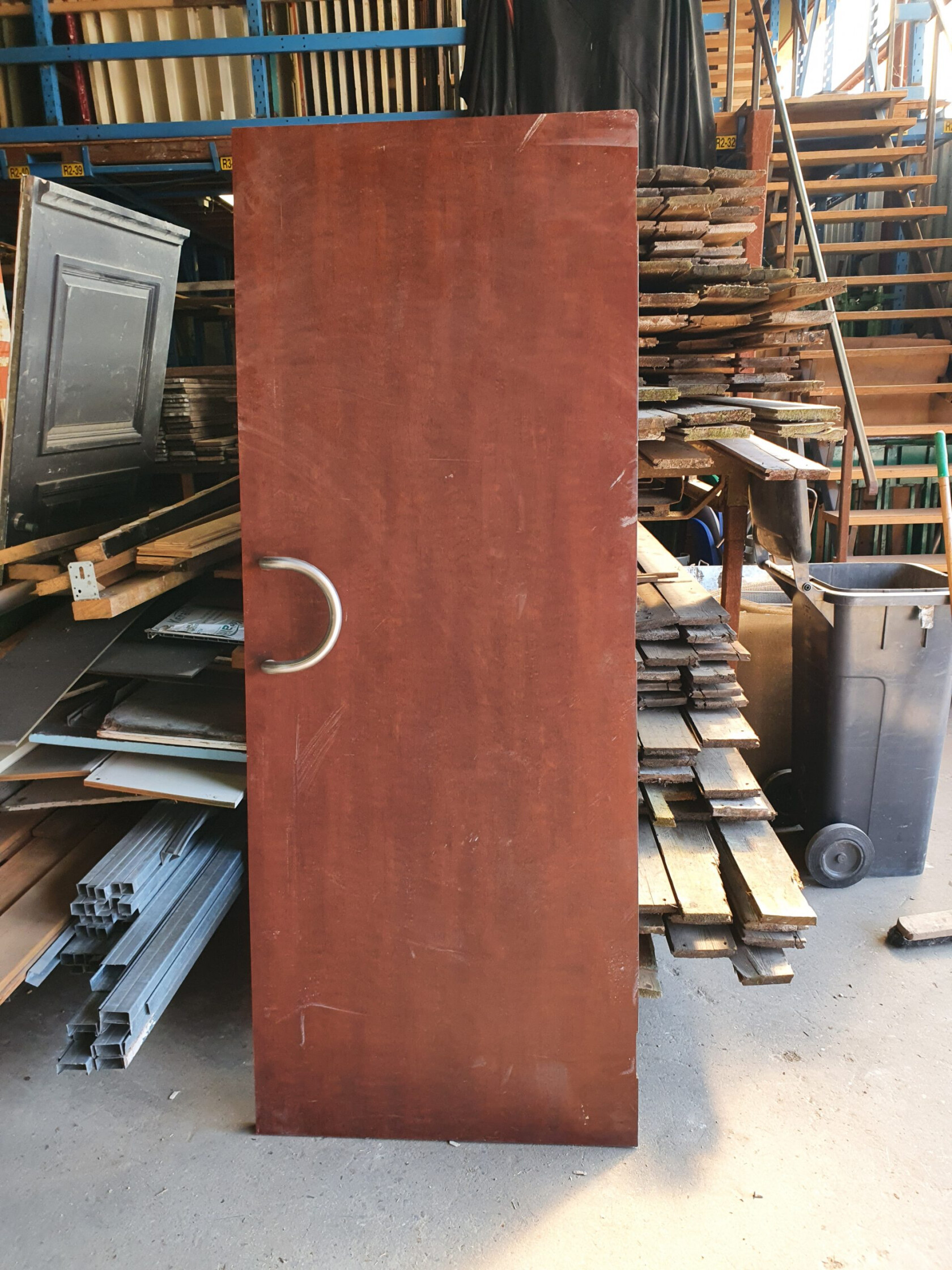 Stompe binnendeur, bruin van kleur. De achterkant van deze deur bevat een zwarte plaat.
