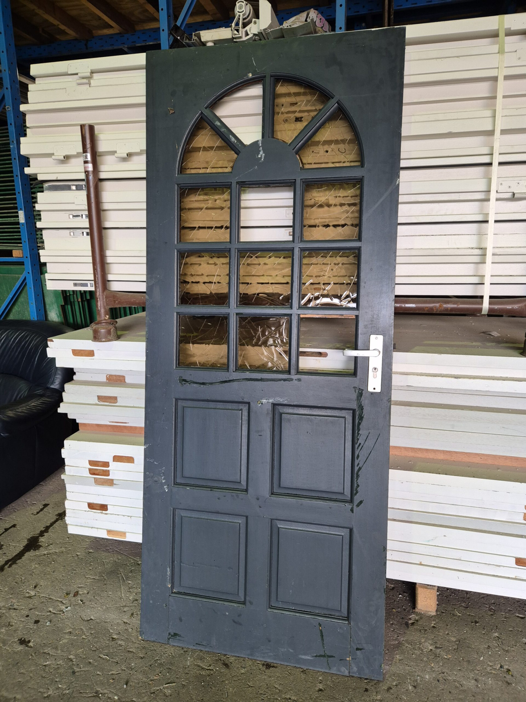 Buitendeur met ruitjes waarvan er een aantal helaas gesneuveld zijn.