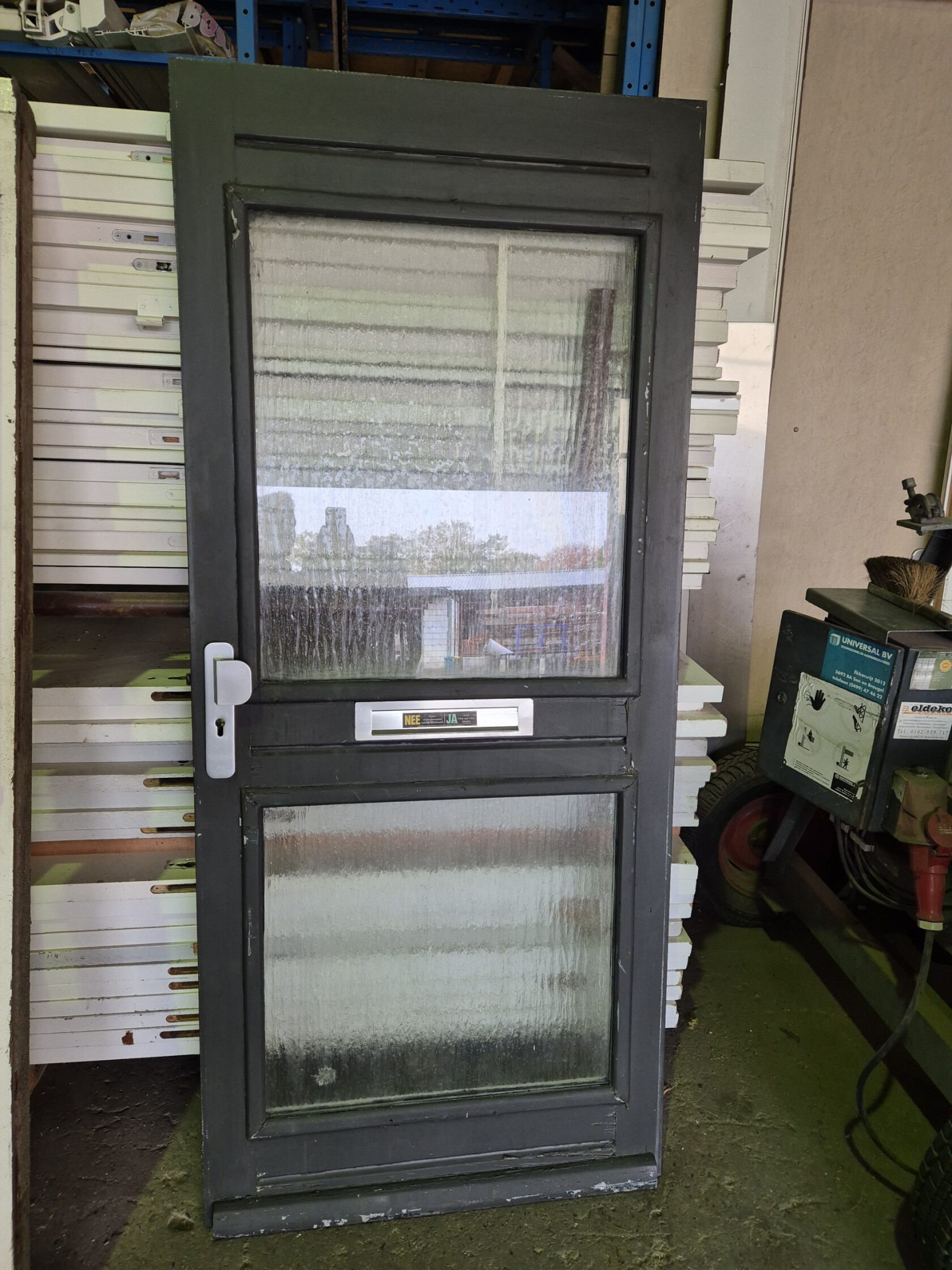 Gebruikte voordeur met twee glazen panelen en een brievenbus. Kan een opknapbeurt gebruiken.