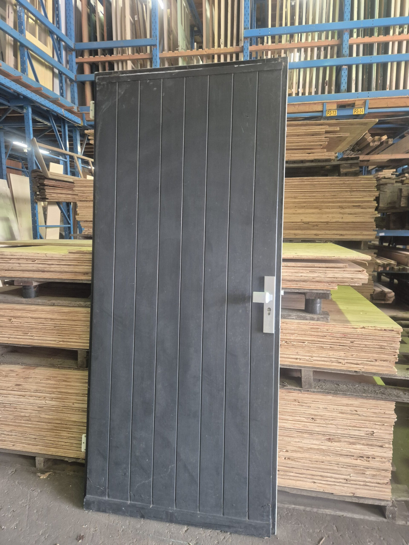 Hardhouten buitendeur die bijvoorbeeld als voordeur of schuurdeur zou kunnen dienen. De deur bevat een slot waar het cilinder wel vervangen zou moeten worden.