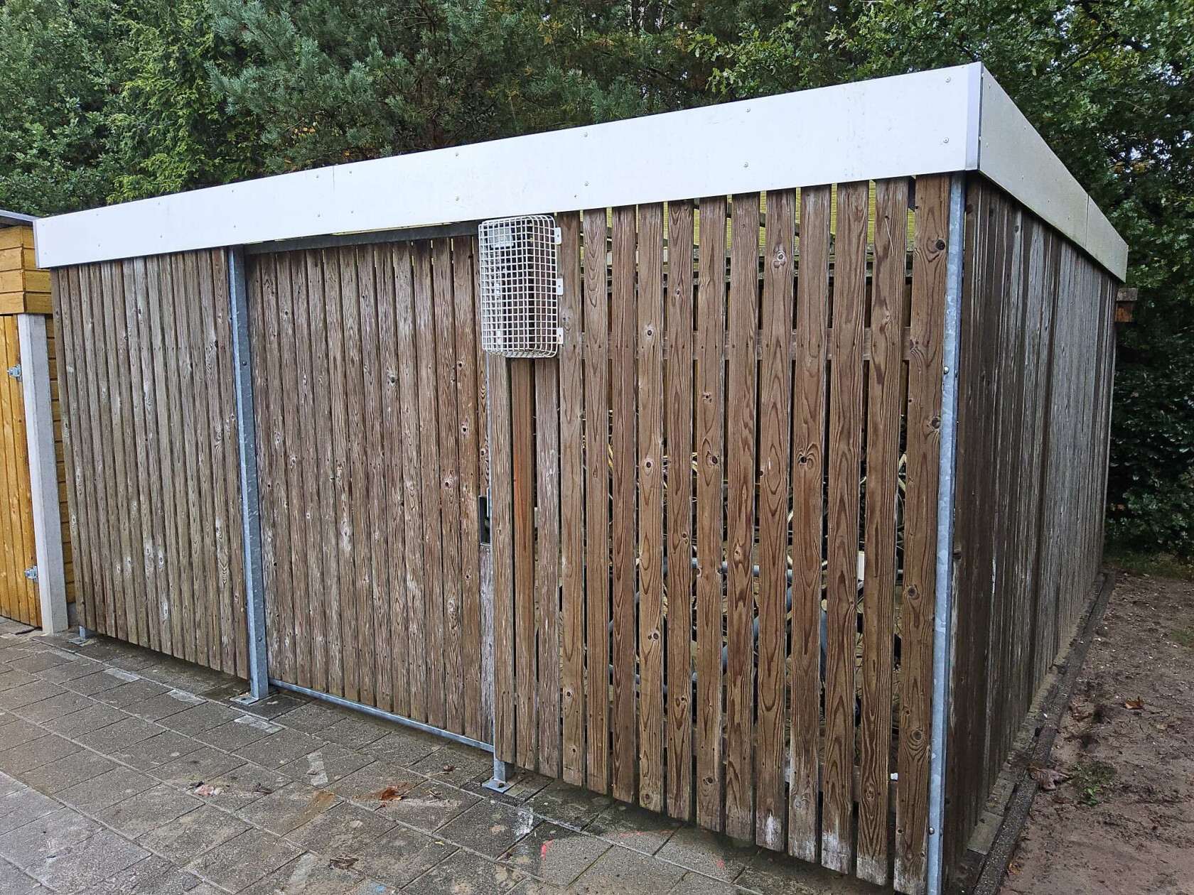 Fietsenstalling, van hout en staal. In goede staat en prima voor hergebruik!