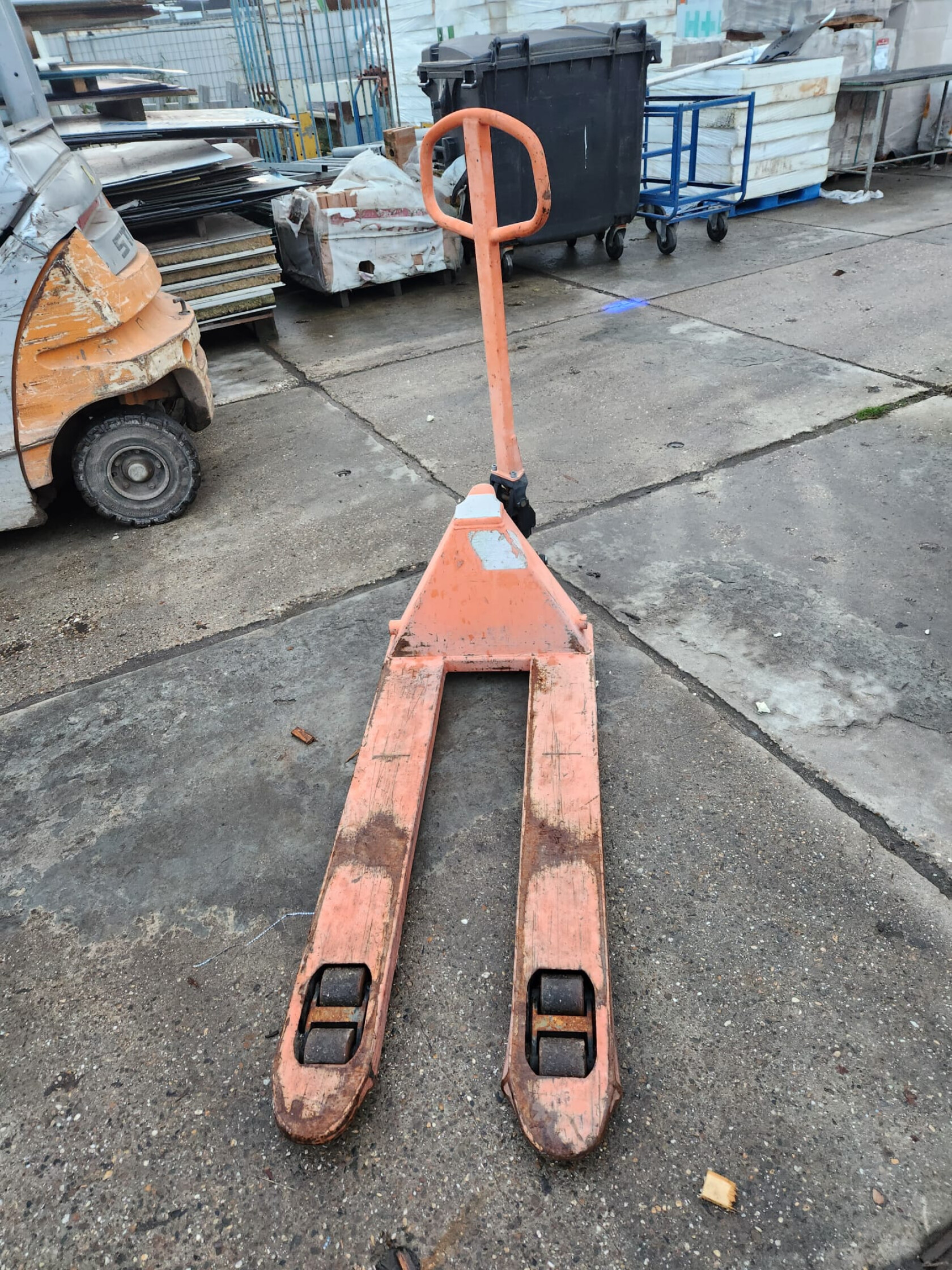 Pompwagen, palletwagen. Nog goed werkend. Linkerlepel aan voorkant iets verbogen, niet hinderlijk bij gebruik.