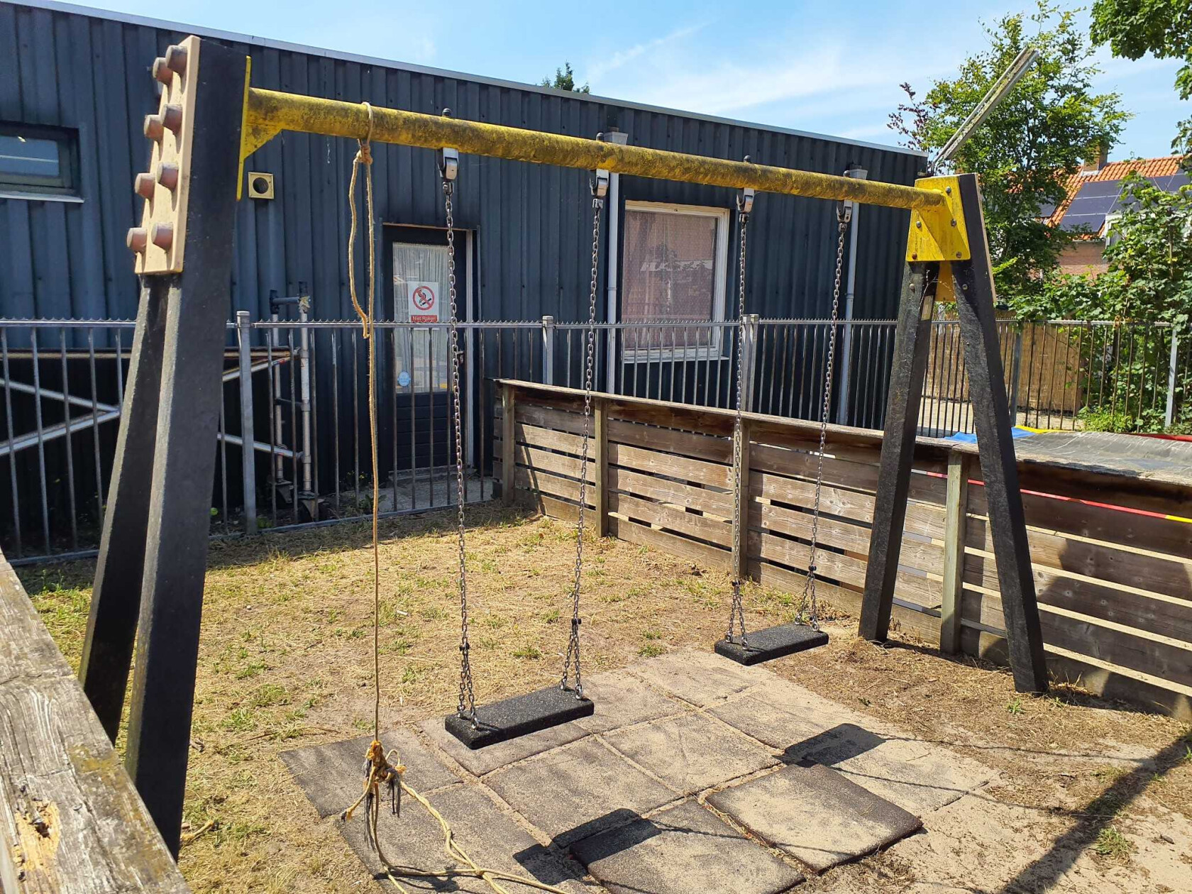 Speeltoestel - Dubbele schommel en slingertouw. In gebruikte staat, en gedateerd, maar na even nakijken nog goed voor hergebruik voor particulieren en/of vereniging.