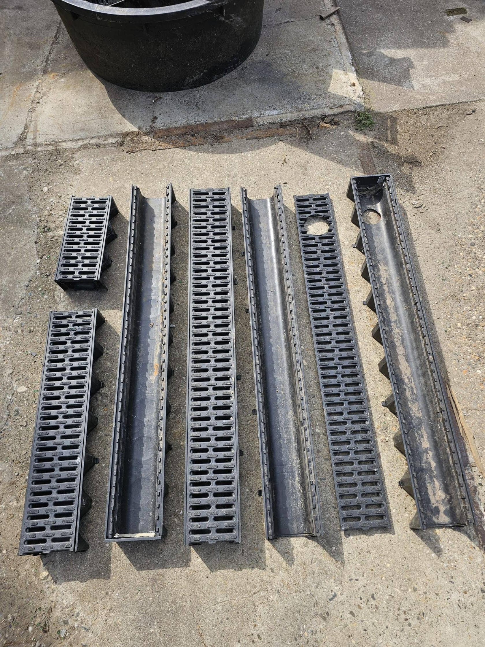 Watergoten: Afmetingen: 100 cm lang Aantal: 7 Prijs: €7,50 per stuk Afmetingen: 60 cm lang Aantal: 1 Prijs: €4,50 Afmetingen: 30 cm lang Aantal: 1 Prijs: €2,50 1x rooster met rond gat diameter 80 en 1x goot met rond gat diameter 60 mm. 2 eind stukken.