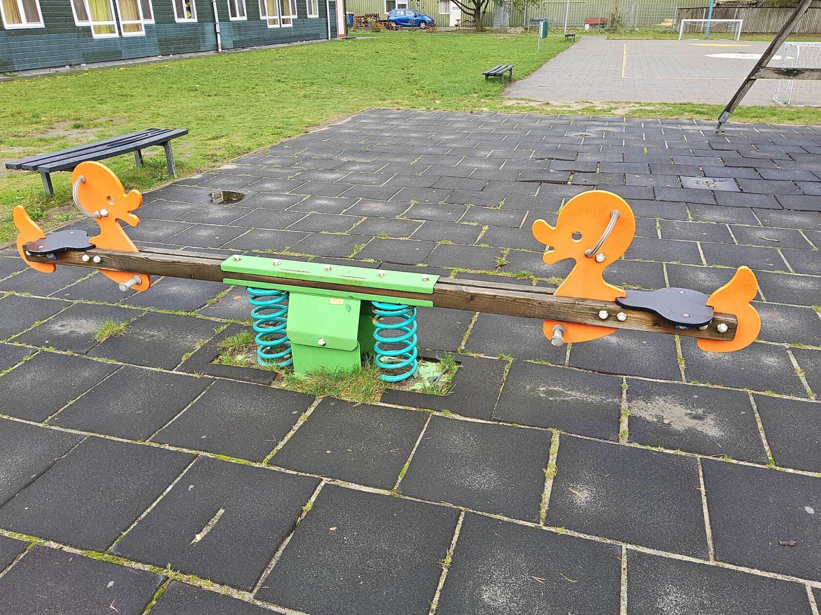 Wip op veer, in de vorm van eenden. Een variant op de welbekende \"wipkip\". Zeer degelijk, gebruikt toestel, nog goed voor een 2e Kans!