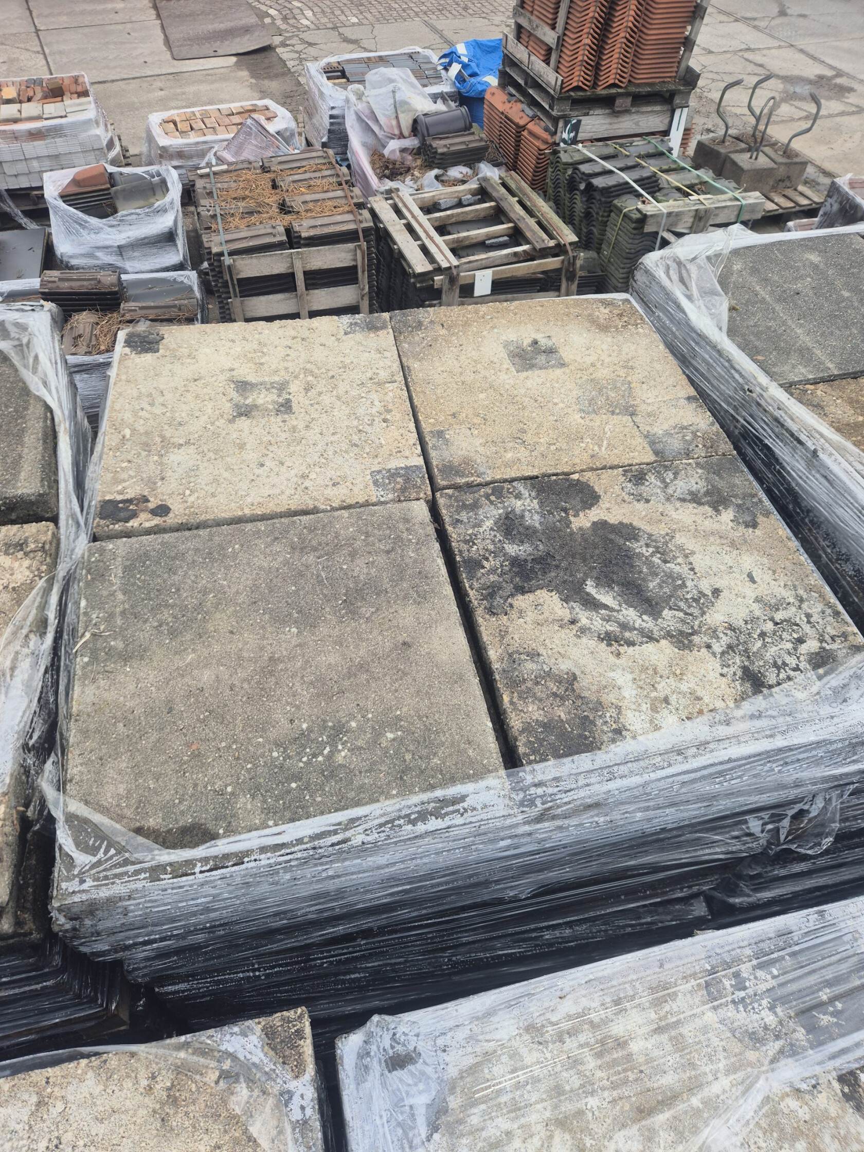 Flinke partij met beton tegels - terras tegels. Deze tegels zijn afkomstig van een dak. Een kant is schoon, de andere kant heeft wat resten van de eerdere dakbedekking.