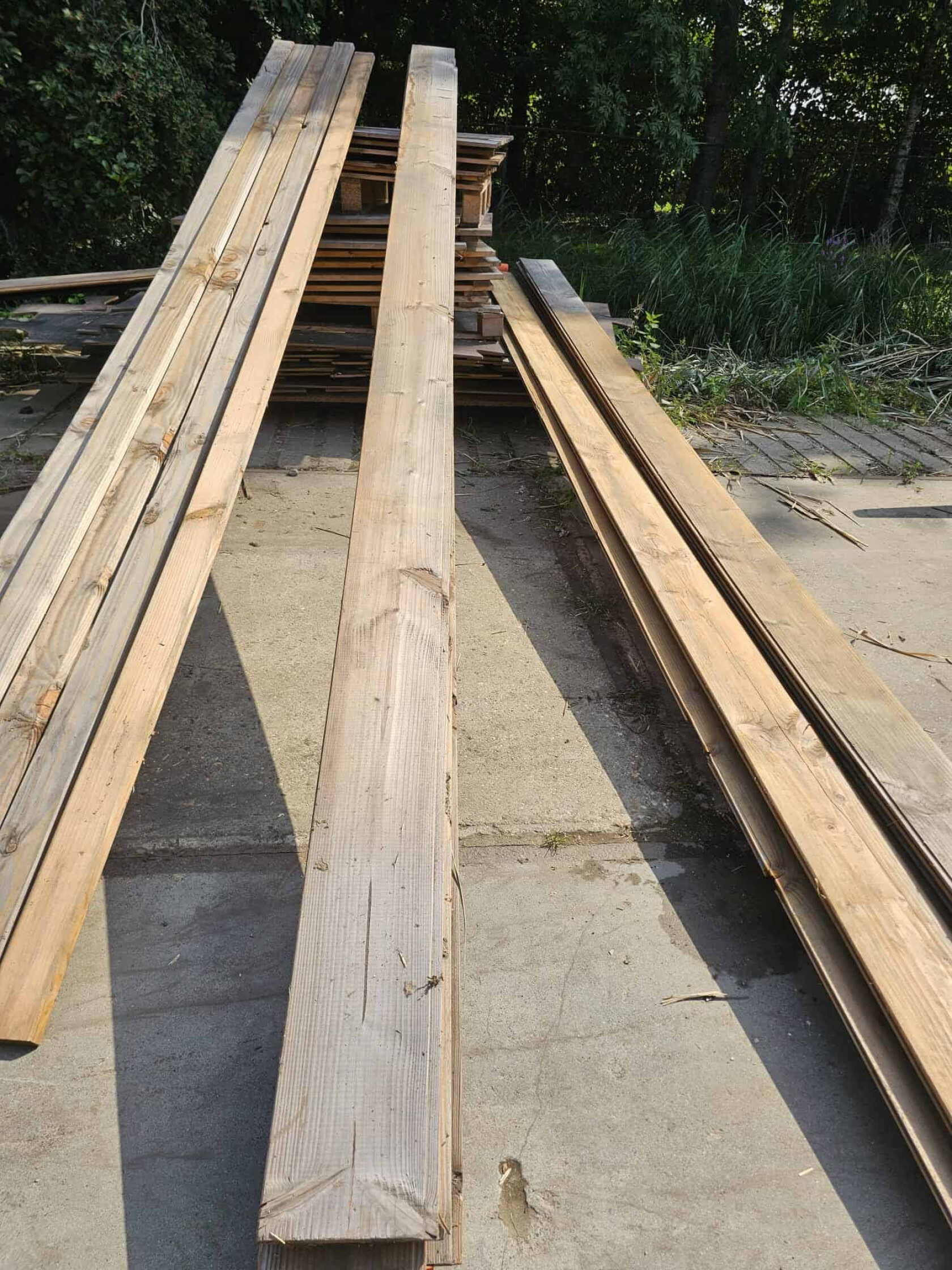 Dakbeschot/vellingdelen: Afmetingen: 5000 x 175 x 18 mm Aantal: 7 stuks Prijs: €10 per plank