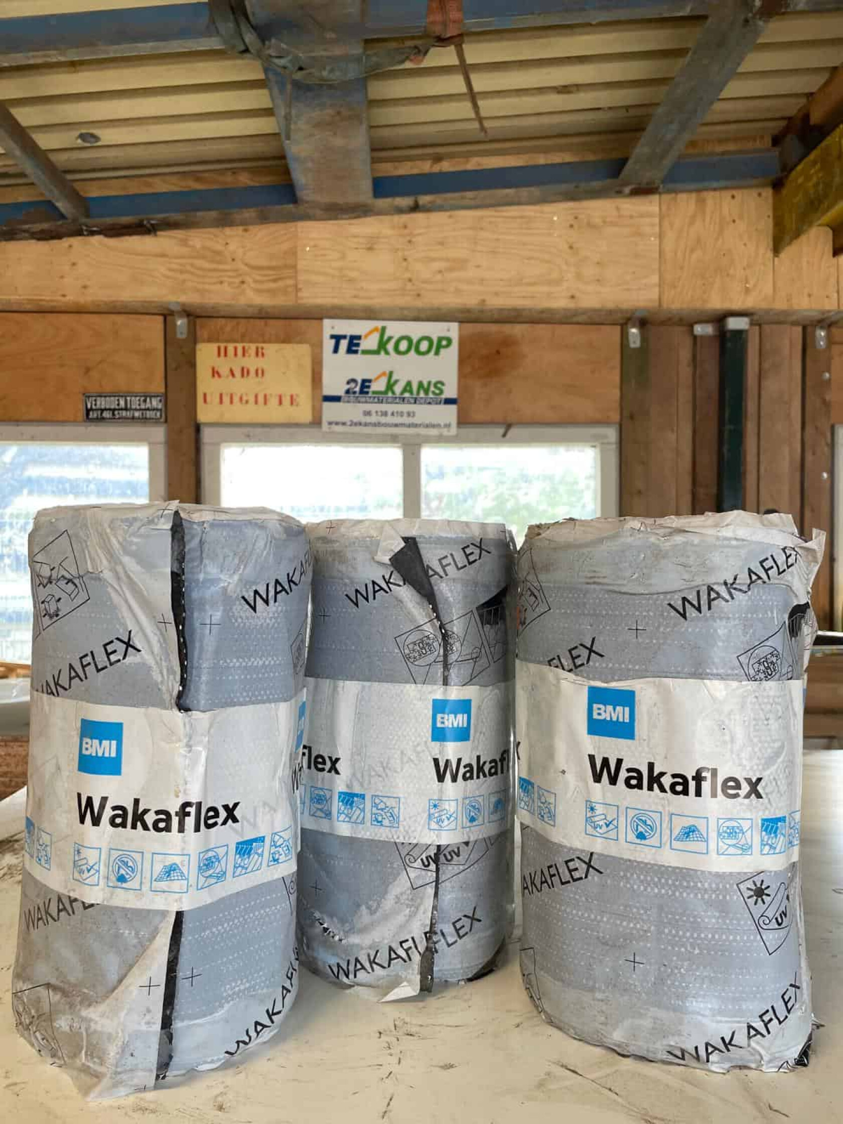 Loodvervanger. Merk: Wakaflex Afmetingen: 10 meter x 280 mm Aantal: 3 plus een aangebroken rol Prijs: €150 per volle rol, aangebroken rol: €100